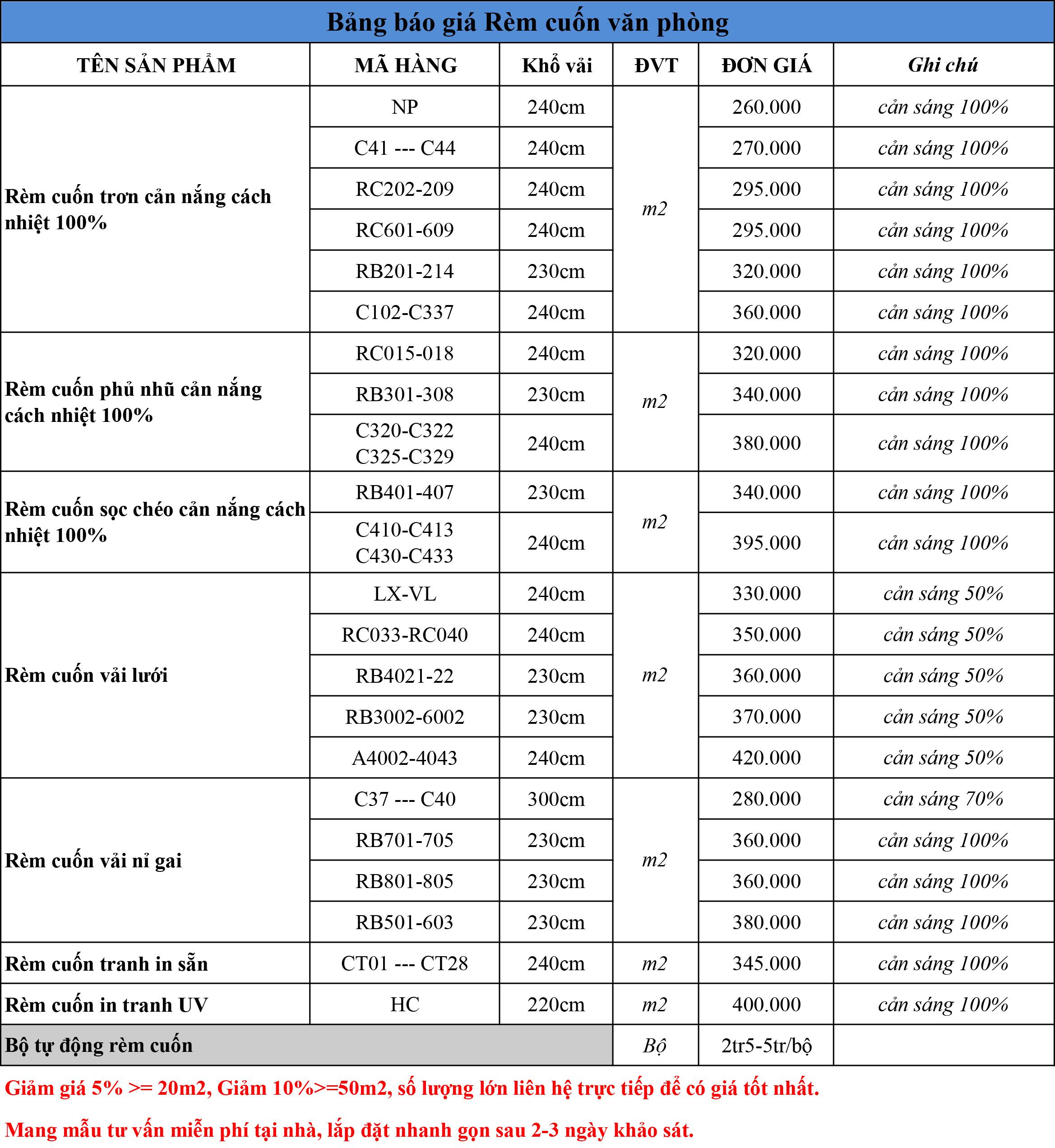 BẢNG BÁO GIÁ RÈM CUỐN - RÈM NHẬP KHẨU ĐĂNG KHOA