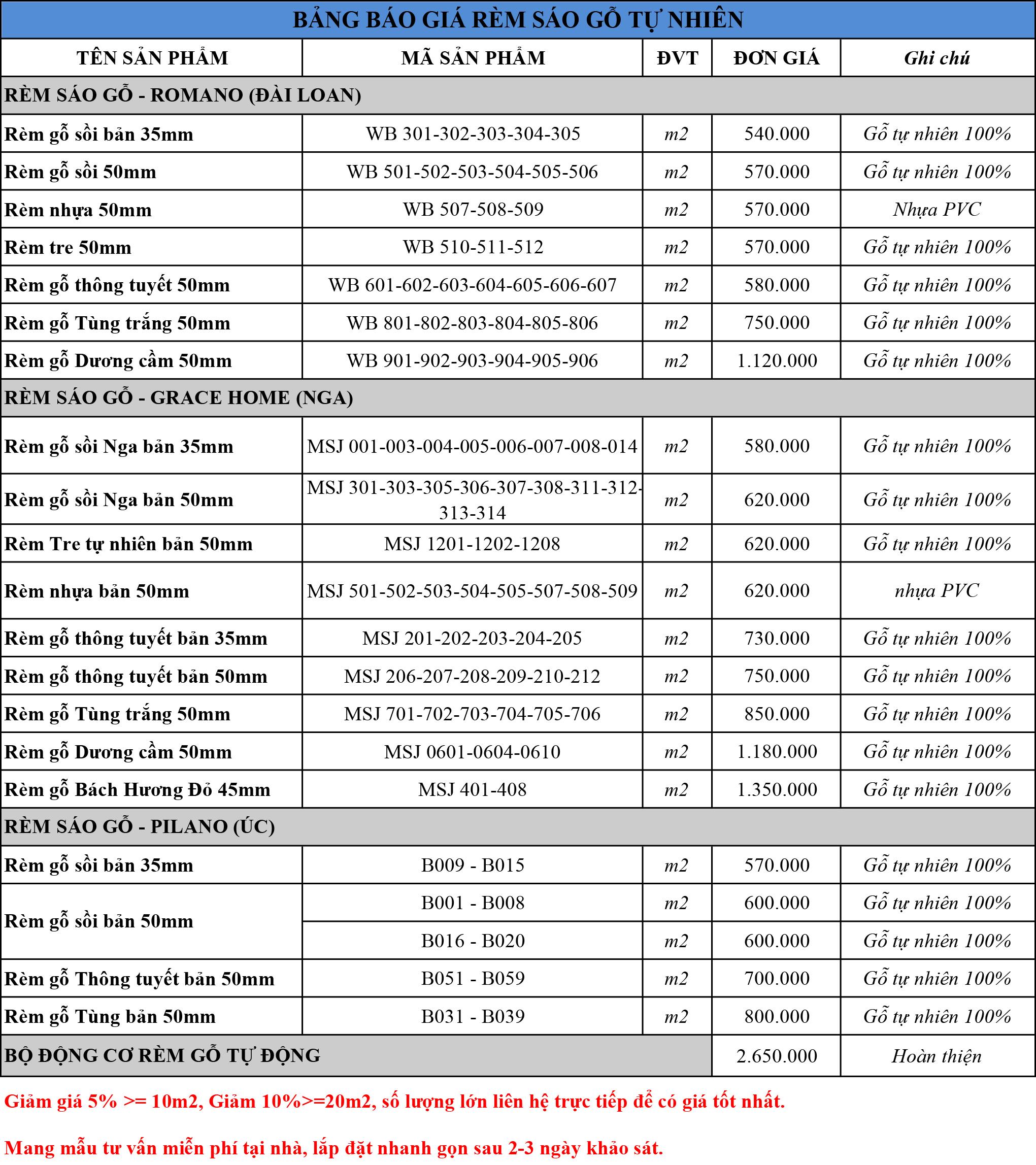 BẢNG BÁO GIÁ RÈM SÁO GỖ - RÈM NHẬP KHẨU ĐĂNG KHOA