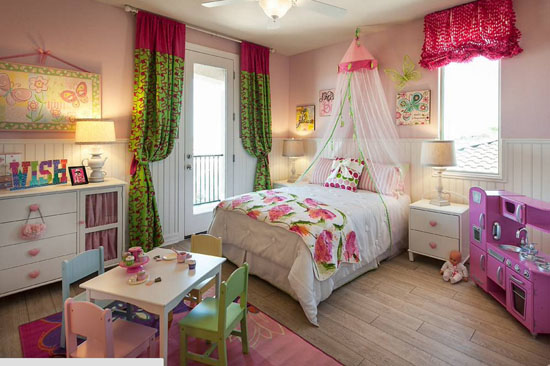 Nếu các bé trai yêu thích những màu sắc khỏe khoắn như xanh, đỏ thì màu hồng phấn luôn là một lựa chọn được ưu tiên hàng đầu trong thiết kế nội thất phòng ngủ cho các bé gái. Nó mang đến một không gian dịu dàng, nữ tính và đáng yêu. Lựa chọn rèm cửa hồng họa tiết chấm bi, cùng tone màu với chăn gối và armchair mang đến một tổng thể không gian hài hòa tuyệt đối về màu sắc. Cùng với nghệ thuật vẽ tường ấn tượng, chắc hẳn bé yêu sẽ thích mê căn phòng này.