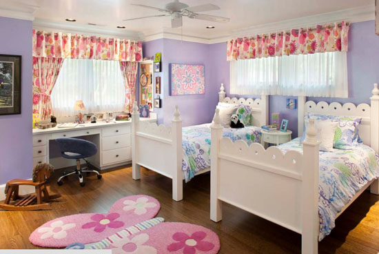 Ngoài màu hồng thì màu tím nhạt cũng là màu sắc được các bé gái yêu thích. Trên đây là một gợi ý cho những gia đình có hai cô công chúa nhỏ. Với thiết kế nhỏ gọn và ngăn nắp, các bé sẽ thỏa sức cùng nhau vui đùa trong chốn không gian riêng. Rèm cửa được lựa chọn gam màu hồng, kết hợp với sơn tường màu tím để không gian có sự tươi mới về màu sắc.